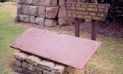 In McKeesport, Lukens continued to run his iron mill for several more decades "with almost unheard of success," said the Pittsburgh Post. He sold it in about 1899 to the American Sheet Steel Company which in turn was acquired in the formation of United States Steel Corporation. Many years later, in July 1918, the Minerds' aged son Isaac returned to the family's old residence for a birthday picnic thrown by his niece Mary (Williams) Morrow and her husband. Reported the Courier, "the picnic was held at the Wharton Furnace, near the Summit, the old home and birthplace of Mr. Minerd. The house in which he resided is torn down, but a part of the old furnace and the orchard are still there. The apple trees are laden with fruit. A most enjoyable day was spent by all present." In 1961, the Fort Necessity Lions Club and Historical Society of Western Pennsylvania together pursued fundraising to restore the furnace's "work arch." The furnace was repaired in 1962 by the Pennsylvania Bureau of Forestry, with the surrounding area cleared for use as a small public park. According to a July 1965 article in the Historical Society's Western Pennsylvania Historical Magazine, "A Guide to the Old Stone Blast Furnaces in Western Pennsylvania, Part III," "The stack is to be kept as a memorial example to the iron industry which played an important part in the early history of Fayette County." Then in 1991, the furnace was listed on the National Register of Historic Places. Great-great-great grandson Robert Arnold McDowell -- of the family of Charles Widdup and Etta (Minerd) McDowell -- included a brief discussion of the property in his self-published masters thesis, entitled Stone Iron Furnaces of Fayette County, Pennsylvania. One of the last ingots produced at the furnace, seen here, today is on display at the site. It was donated to the Fort Necessity Lions Club by the family of John Myers.