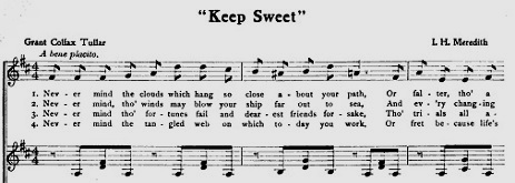 The other of the two boys I asked to aid in getting my material and apparatus ready for the two experiments I have mentioned above, and won him thru that now he is a staunch friend. No accident marred the day, and the only thing regrettable was the sickness of two of the boys. Chas. V. ["Valco," seen here] got car sick on the way out and Willie B. became very sick later in the day. An abscess on his heel, from an infected blister, had been neglected and set up a toxic condition throughout the body. His temperature and pulse were very high, and he couldn't get his shoe on for the swelling. Dr. L., the superintendent, took him home in his car and he recovered in a few days. The neglect had been on his part. He had failed to report to the nurse for treatment as he should, but he was scarcely to be criticized for that, for the nurse instead of being gentle and sympathetic and helpful, was exactly the opposite and treated the boys in such a way that, rather than "beard the lion(ess) in her den," they endured their aches and sufferings in silence, not even reporting such inhuman actions to their caretakers or the superintendent for such time. However, "murder will out," and she was dismissed. About this time I taught them a song of Tullar Meridiths's -- "Keep Sweet," and it sort of stormed the castle. The chorus was on the lips of everyone and "Keep Sweet!" was heard from every corner if someone got out of humor. [Editor's note -- This song was developed through the Christian Endeavor organization, and Tullar Meridith Company was a successful New York City publisher of Methodist and evangelistic music at the time.]