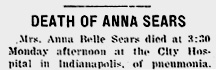 Anna Belle (Boyd) Sears was born in March 1860/1861 and raised near Greenfield, Hancock County, IN, the adopted daughter of William E. and Maria J. (Bush) Boyd. Anna's sister, Ellen "Nellie" (Boyd) Mundelle, also was raised by the Boyds, but the fate of a brother, Michael Thompson, is unknown. They together produced one daughter, Josie Beaver, and raised two granddaughters, Nelle "Marie" (Beaver) Hutton and Catherine (Beaver) Hamilton Wing. In 1880, when William was 25 and Annie 21, they resided with the Boyds on their farm northeast of Greenfield. The Greenfield Daily Reporter once said of William that he "lived in this county all his life, having been engaged at farming the greater part of the time." When the federal census enumeration was made in 1900, the Searses were on a farm next to Anna's parents in Center Township, Hancock County. Later, they moved into town, residing at 429 Walnut Street in Greenfield.