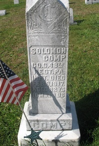 Solomon Comp was born on St. Patrick's Day 1834 in Southampton Township, Somerset County, PA, the son of Jacob and Elizabeth "Betsy" (Sturtz) Comp. He was one of many in the family to serve in the Union Army during the Civil War. He grew up knowing and playing with a neighbor boys Jonathan Hyde, John C. Pfeiffer and David Smith who all later came to his aide when attempting to obtain a military pension. As an adult, he stood 5 feet, 6 inches tall, with a dark complexion, dark hair and blue eyes. He was considered by friends as a "sober, peaceable man of good habits." Solomon resided as a young man in Dry Ridge, Bedford County, PA. On Oct. 29, 1857 (or Oct. 23, 1858), he was united in holy wedlock with Rachel Beltz (1834-1863), also a Bedford resident. Justice of the peace G.W. Horn officiated, and news of the wedding was published in the Bedford Gazette. Prior to marriage, Rachel had been employed by the father of Cornelius Diehl in Bedford County. They together produced three offspring -- Mary Catherine Riley, Jacob Adam Comp and John Wesley Comp. The Comps are shown on the 1860 federal census, making their home in or near Schellsburg, Bedford County. Sadly, Rachel passed away in May (or June 10), 1863, in Buffalo Mills, possibly in childbirth with their son John Wesley. During the war, Solomon registered for the Union Army draft and was marked as married. On Sept. 21, 1864, now drafted, he joined the army as a member of the 48th Pennsylvania Infantry, Company G and was sent to Chambersburg, PA for basic training. Within the week of entering the army, he married a second time -- on Oct. 23, 1864, at the home of her father -- to Margaret Ann Corley (Jan. 19, 1850-1933), daughter of Joseph and Sarah (Hurst) Corley of Dry Ridge, Juniata Township. Rev. N.H. Skyles officiated. Among those attending was Solomon's brother, Adam Andrew Comp, who shortly thereafter also joined the army. News of the wedding was printed in the Bedford Gazette. Margaret was neither able to read or write. She once said that she and Solomon "was both raised close to gether, have tended the same church and have bin acquainted ever since we was small." They went on to bear these additional 10 offspring -- Emma S. Robb, Sarah Elizabeth Reams, Elmira Cecilia Sleek, Joseph C. Comp, Gertrude Comp, Clara B. Comp, twins Humphrey Albert Comp and Harry L. Comp, Susanna M. Hochard and Elsie J. Sorber. As the babies were born, their names were written on a sheet of paper placed among the page of the family Bible.