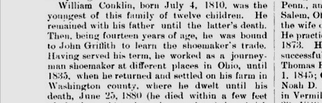 ~ Son William Conklin ~ Son William Conklin (1810-1880) was born on the Fourth of July 1810, in his parents' log cabin in Sparta, Washington County, PA, the youngest of a dozen children. William remained at home with his parents until his father's death in 1824. Under the terms of the father's will, William received a one-third share of the family farm along with a bed and bedding. Thus age 14 at the time, fatherless, William "was bound to John Griffith to learn the shoemaker's trade," said his biographical profile in the 1893 book Commemorative Biographical Record of Washington County, Vol. 1, published in Chicago by J.H. Beers & Co. "Having served his term, he worked as a journeyman shoemaker at different places in Ohio, until 1835, when he returned and settled on his farm in Washington county, where he dwelt until his death." On March 2, 1838, he entered into marriage with Catharine Ross (May 16, 1818-1909), daughter of Jacob and Abigail Ross and granddaughter of John and Elizabeth Ross of Greene County. Catherine's father was a prominent drover -- a driver of cattle or sheep to market. Catharine's grandfather was the first landowner at Ruff's Creek near Jefferson, PA. He owned slaves and often was in conflict with local Native American tribes. He was one of the first followers of the newly emerging Disciples of Christ denomination in the region and often rode to Bethany, WV mounted on his large sorrel horse Mose to hear preaching by the Disciples' founder Rev. Alexander Campbell. Catharine's mother is said to have had "remarkable eyesight and strength [and] was out overseeing her farms in Richhill township ... up to a few days before her death." Together, William and Catharine produced a large family, among them Phoebe Jane Meek, William "Allison" Conklin, Benjamin "Franklin" Conklin, Thomas H. Benton Conklin, Cinderella Sowers, Gleason Philetus Conklin, Harriet Ophelia Belle Conklin, Catherine Ivagenia McClain and Ross M. Conklin. Sadness blanketed the family when son Thomas died at the age of about a year on June 1, 1845. The United States Census of 1850 lists the Conklins living on a farm in Morris Township, Washington County, with William's elderly, widowed mother in the household.