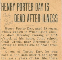 Great-grandson Henry "Porter" Day (1873-1932) was born on March 20, 1873 in Old Concord in the Gale District of Washington County. He was joined in wedlock with Nancy Margaret "Nannie" Martin (Aug. 21, 1877-1974), a native of McMurray, Washington County. A newspaper once said that Porter "spent the early years of his life [in the Gale district] on the farm of his father. He then purchased the Simpson farm on which he resided, specializing in the raising of fruit. For a few years he conducted the Central Hotel at Claysville and for a time also engaged in the restaurant business in Washington as one of the proprietors of the Cafeteria in East Beau street. Failing health caused him to return to the farm." Henry and Nancy dwelled together near the Joint School along Craft Creek near Prosperity, with a post office of Dunns Station. They were the parents of an only son, Raymond Everett Day. Porter contracted influenza in early 1932, and the illness appears to have lingered. Heart disease developed, and he declined into death at the age of 59 on Oct. 15, 1932. A newspaper obituary said he was "widely kinown in Washington County..." Funeral services were held in the Days' home, led by Rev. J.B. Miller of Old Concord Presbyterian Church and aided by Rev. Jacob Ruble of Pigeon Creek. The remains were interred in Prosperity Cemetery. After Porter's death, Nannie waited a baker's dozen years before marrying again. On July 28, 1945, she wedded a second time to high school principal Edward Finley Westlake (Aug. 7, 1879-1964), son of James Fletcher and Mary (Fouche) Westlake. Edward passed away in Washington on Aug. 29, 1964. She died in Washington in late December 1974. Their only son Raymond Everett Day (1903-1988) was wedded twice, first to Irene Black (June 6, 1897-1948), daughter of J. Miller and Lizzie (Dillie) Black of Prosperity. They too produced an only son, Reed Black Day. They dwelled at 18 Thayer Street in Washington. Raymond earned a living for years as a salesman for General Woodcrafting Company of Canonsburg. Sadly, in March 1948, Irene underwent abdominal surgery for ovarian tumors in Washington Hospital. During the operation, she was stricken by a cerebral embolism and died on St. Patrick's Day 1948, age 50. Her remains were laid to rest in Prosperity Cemetery. Raymond outlived his first wife by four decades. In 1959, his home was at 179 Main Street, Washington. He then was joined in marriage on Feb. 21, 1960 with Mildred Mardell Ullom (Oct. 10, 1904-1995), the great-aunt of the founder of this website, and the daughter of Lantz Hupp and Maud A. (Hinerman) Ullom. Raymond held memberships in the Washington lodge of the Masons, the Scottish Rite of Pittsburgh, Syria Temple, Syria Temple Automobile Club and El Tor Grotto of Wheeling, WV. The couple loved to attend dances. They lived for many years in the old Ullom residence on North Franklin Street in Washington, with their final years in an apartment on Beau Street. Raymond died in Washington Hospital on Feb. 9, 1988. Mildred joined him in death on March 14, 1995. Raymond and Mildred sleep for eternity in the Ullom family lot in Washingtn Cemetery. Raymond and Irene's son Reed Black Day (July 6, 1924-1959) was born in Washington. He married Esther Faye Magill (May 15, 1930-1959), daughter of James A. and Faye Magill. The pair were the parents of an only son, James Raymond "Jimmy" Day. The family dwelled in Taylorstown, Washington County, where Reed earned a living as a utility worker. Reed took great pride in owning a small foreign automobile. On the fateful day of June 14, 1959, while the family was driving on Route 2 about five miles south of St. Marys, Pleasants County, WV, their small car struck an oncoming vehicle head-on. Reed and Esther were killed instantly, and their son died in an ambulance en route to a hospital. The United Press International prepared a story that was distributed widely to newspapers throughout Pennsylvania. It reported that a driver from Charleston, WV had "swerved to avoid hitting another vehicle and slammed into Day's auto." Their remains were transported back to Washington for interment in Washington Cemetery.