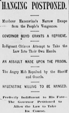 At the moment Albert began to plunge to an inevitable death, the rope broke, "too weak to hold the weight of the condemned man and when he fell it snapped, and gasping and groaning he went through the trap to the ground below," reported the Columbus (NE) Journal. The people were there for an execution, however, and this incident, though fearfully trying on nerves, did not deter the sheriff more than momentarily. A new rope was secured as soon as possible, and the sheriffs of other counties, who were present for the purpose of learning something of executions, hastened to conduct the unfortunate man up the scaffold once more, where his pinions were once again adjusted and the new rope placed about his neck. This time better provision had been made and the body was caught up with a sudden jerk which left no room for doubt that the second trial was successful. News reports said that the body was left hanging some minutes after physicians pronounced him dead. The crowd waited even longer, and, said the McCook Tribune, "the expression of grim satisfaction at the vengeance dealt out to the murderer... was general." The sensational news was published far and wide, including on the East Coast, and an 8-inch by 6-inch mounted sepia-toned photograph of the hanging was sold popularly as a novelty. Over the years, the case has been featured in books, newspapers and magazines devoted to Nebraska history, public justice and capital punishment. Among them was Solomon D. Butcher's Pioneer History of Custer County, Nebraska, published in 1901 (page 253).
