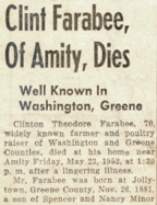 In describing Clint, a newspaper once said: Before moving to Amity, he lived near Waynesburg and operated a local coal mine with his brother, Cleve, as a partner. He also was engaged in farming in Greene County, specializing for a time in raising swine. [He] had resided near Amity since 1918 and engaged in poultry raising on a large scale and farming. His flocks at times numbered 8,000 to 10,000 birds.
