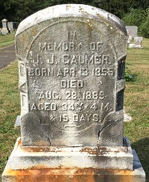 Son John Joseph Gaumer (1855-1889) was born on April 13, 1855 in Upper Milford Township, Lehigh County. Unmarried at the age of 25, he lived at home with his parents and labored as a coal miner. He eventually married Alwilda L. Ziegler (Nov. 6, 1861-1926), daughter of William and Caroline (Ettinger) Ziegler. Her name also has been spelled as "Alevesta" and "Aravilda." The couple went on to produce a family of five children -- Mabel Violet Ott, Caroline Estella Gaumer, William Joseph Gaumer, Harvey Leon Gaumer and John Adam Gaumer. At the births of two of the children in the early half of the 1880s, the babies were baptized by Rev. Thomas N. Reber in Solomon's Evangelical and Reformed Church in Macungie. In about 1886, John borrowed a sum of $563 from his father. The amount was never repaid in the son's lifetime. The Gaumers were farmers, and their home in 1889 was in Salisbury Township, Lehigh County. John was a member of a local camp of the Patriotic Order of the Sons of America. In the spring of 1889, he contracted an intestinal disorder "during the haying season ... by working too hard," said the Allentown Democrat. "He resided on the Kemmerer farm, about midway between this city and Emaus, and daily furnished milk supplies to several large consumers in this city." Sadly, John's intestinal problems continued into summer, and the Democrat noted that "his recovery is very doubtful." He passed away at the age of 34, on Aug. 28, 1889. Rev. T.N. Reber officiated at the funeral services held in Macungie, with burial in what today is the cemetery of Solomon's United Church of Christ. His brother-in-law, Leon L. Snyder, served as administrator of the estate and placed estate notices in the Democrat. His age at death was 34 years, four months and 15 days. His grave marker was carved by "Becker." The family avoided another blow when learning that, although a member of the POSA, the camp was not in existence long enough for sick and funeral benefits to be paid out. Because the sons were so young, the camp agreed to waive its rule and donated the funds that the family would otherwise have received. An estate sale was conducted in November 1889, which included 2 heavy-built bay horses, considered "good and gentle workers;" 2 black mares, one a heavy brood mare, "good workers and gentle drivers;" a year-old grey stallion; 8 good cows; a heifer; 2 breed sows; 7 shoats; a good dog; 2 four-horse wagons; a two-horse wagon; a one and two-horse wagon; a top spring wagon; a top buggy; a buggy; 3 ore bodies; a two-horse body; a stone body; 2 new bobsleds; a wood sled; a truck sleigh; and a sleigh. The inventory also included a Champion seed drill; extra land roller; horse hay rake; Champion binder and new canvas; a scraper; a corn plow; 2 cultivators; a Huebner threshing machine with a one-horse treadle power and belt; a grain fan; feed cutter; cutting box; hay ladders and bolsers; horse dung hook; carriage pole; 2 scythes and sheaths; 2 plows; wagon boards; plow truck; 2 harrows; 2 feed troughs; a lady's saddle; log and other chains; 2 sets of light single harnesses; a set of light double harness; heavy harness; and interest in 10 acres of corn. The IOU from 1886 was not settled until about 1912, after the death of John's father, when the sum of $563 was to be withheld from a cash distribution to John's children.