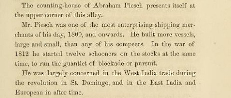 They are said to have built mansion at Sixth Street and Rising Sun Lane in Franklinville. He was a well-known ship owner and East India shipping merchant in Philadelphia, said to have been in business with his wife's brothers Samuel, Jacob, Sebastian and Henry. His "counting-house" and offices were located along Water Street between Race and Vine. He also was an incorporator and board director of the Marine and Fire Insurance Company of Aurora, IL. The History of Philadelphia by John Thomas Scharf and ?Thompson Westcott (1884) said that Abraham made his early fortune using a fast schooner named the Fly, which: