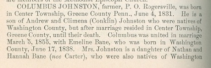 Four children born to this marriage included Nathan Bane Johnston, Elizabeth L. "Lizzie" Rush, Dora May Johnston and Lewis B. Johnston. The family mourned at the death of son Lewis in infancy circa 1865. Said the Waynesburg Republican, Columbus was "a man of upright character, known for his integrity, and had been engaged in farming and stockraising for many years, in which he was unusually successful. In politics he was a firm believer in the principles of the Republican party. He had been a member of the South Ten Mile Baptist church for over fifty years and led a devoted Christian life." The couple resided in 1870-1890 near Rogersville, Greene County. That year, Columbus was profiled in the History of Greene County, authored by Samuel P. Bates. The short biography said that he had "made farming his business through life, and by strict honesty and industry has procured a nice home, consisting of 108 acres of land, where he and family reside."
