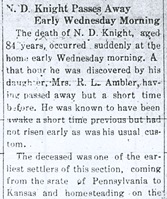 Norman outlived Sarah by five years. He wrote on a pension application that he "can not dress himself or attend to his needs and wants. He cannot put on his shoes, or other articles of clothing without assistance." During his last physical checkup, on June 27, 1923, his weight had fallen to 119 lbs. He complained bitterly of pain in the muscles of his arms and shoulders, as well as his back and lower limbs. Doctors noted that his "hands tremor so that [he] has no control of them. Some tremor of lower extremities but not so bad as the hands." Norman died at age 84 on Oct. 31, 1923. Having stirred in bed that morning, he died as he was awakening. His body was discovered shortly afterward by daughter Nellie Ambler, who had come into his room to check on his delay in arising. He was buried with Sarah, and beside their young daughters Katie and Lena, from whom death had separated him almost four decades earlier. In front-page obituary, the Burrton Graphic called him "one of the earliest settlers of this section, coming from the state of Pennsylvania to Kansas and homesteading on the farm in Valley township in 1871 where he resided for many years with the family before retiring and moving to Burrton. He was preceded in death several years by Mrs. Knight. He was a civil war veteran and a member of the Grand Army Republic." In October 2011, Norman's distant cousins Mark Miner and Eugene Podraza came to Central Kansas to research the Knights and their legacy. They copied documents in the Harvey and Reno County courthouses, and visited local libraries to track the family's paper trail. They also visited the Burrton Cemetery to pay their respects at the Knight and Ambler graves, and to photograph them for posterity.