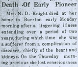 ~ Final Years ~ Heartache again shook up the family in the summer of 1905. Grandson Ross Ambler, age 12, came down with an incurable illness while "working in the country for some time," reported the Burrton Graphic. Despite "the best of medical care," he died on July 27, 1905, with burial in the Burrton Cemetery. In the 1910s, the Knights decided to retire after a lifetime of farming, and moved into a dwelling in the town of Burrton. During her later years, Sarah was afflicted with a combination of heart and kidney problems. In the summer of 1918, she seemed to suffer what the Burrton Graphic called "a slight stroke of paralysis of the right side." Married daughter Nellie Ambler faithfully provided care over a period of several months.