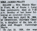 Exponent, 1971 In 1965, to prove her birth, Mamie relied on her West Virginia marriage record, an Equitable Life Insurance policy dated 1938 and the testimony of her 74-year-old uncle Hiram Mayle. Mamie was diagnosed with breast cancer circa December 1957 and endured the illness over the remaining 14 years of her life. She died in Harrison County on March 7, 1971. The Clarksburg Exponent noted that her death occurred "following an extended illness." She was laid to rest in the Knights of Pythias Cemetery in Salem, near Clarksburg. Among her survivors were 11 grandchildren and three great-grandchildren. James lived for another 15 years. He passed away in 1986 and reposes for eternity beside his wife. Daughter Nelda Sonna Pratt (1927-2004) was born on Feb. 17, 1927. On Feb. 5, 1944, when she was 17 years of age, she wed Clarence Eugene "Scotty" Scott (May 21, 1923-1999), a native of Elizabeth, Wirt County, WV. During World War II, Clarence served in the U.S. Navy. She held a membership in the Order of Eastern Star and the Women of the LOOM. Sadly, Clarence died on Oct. 18, 1999. Nelda's home in later years was in Ottawa, LaSalle, IL. She passed away into eternity on Oct. 8, 2004. The body was brought back to West Virginia for interment in Highland Hills Memorial Gardens in Follansbee, Brooke County, WV. Son James Ira "Jim" Pratt (1930-2015) was born on Feb. 11, 1930 in Salem. He is known to have attended Doddridge County High School and to have served in the U.S. Army. When he was 27 years of age, on June 27, 1957, he married 23-year-old Mary Darlene Shreve (Aug. 3, 1933- ? ), daughter of Albert and Letha (Harris) Shreve. Their nuptials took place in Harrison County. They resided in Clarksburg (Wolf Summit) and had two sons -- James Joseph Pratt and Mark Allen Pratt. James was employed for four decades as a field man for Hope Natural Gas Company. Socially, he belonged to the Knights of Pythias and Eagles lodge. He succumbed to the spectre of death on June 17, 2015. Funeral services were led by Pastor Kevin Bender. Burial was in the Knights of Pythias Memorial Park, Salem.
