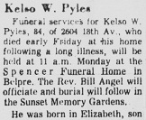 The family relocated to Parkersburg, Wood County WV in the early 1930s and were there circa 1935. Federal census records for 1940 show the family residing in Belpre, Washington County, OH, across the Ohio River from Parkersburg, WV. Employed by the America Viscose plant, he worked as a steam engineer. Their home was on Main Street in Little Hocking, north of the Baltimore and Ohio Railroad. Later, Kelso and Nora returned to Parkersburg, where their address was 2231 14th Avenue. Suffering from pancreatic bleeding, and hardening of the arteries, Nora was treated in St. Joseph's Hospital in Parkersburg. She died at the hospital, at age 75, on Sept. 5, 1967. Burial was in Sunset Memory Gardens in Parkersburg. Kelso outlived Nora by four years. He resided at 20 18th Avenue in Parkersburg. He died on May 28, 1971, at the age of 84, "following a long illness," reported the Parkersburg News. He was buried in Sunset Memory Gardens. Daughter Alma (or "Arma") Pyles (1917- ? ) was born in about 1917 in Ohio and grew up near Elizabeth. She married Ercie Clevenger (1913-1978). Circa 1971, they lived in Parkersburg. Ercie is believed to have succumbed in Parkersburg in September 1978. Son Lloyd M. Pyles (1918-1992) was on June 22, 1918 in Ohio. During World War II and the Korean War, he is believed to have served in the U.S. Army Air Force with the rank of master sergeant. While the Korean conflict was ablaze, he was a crew chief and mechanic on the Spirit of Freeport B-20 Superfortress. After the war, he made his home in Parkersburg and in 1953, retaining the rank of master sergeant, was stationed at Stead Air Force Base in Nevada. Evidence suggests that he had at least one daughter, Sonya Booher. Lloyd made his home in Parkersburg in 1971. He is thought to have died on March 11, 1992 and to rest for eternity in Little Rock National Cemetery in Arkansas.