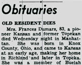By the time the federal census was taken in 1920, Frankie and Leroy were residing in separate households. He maintained his residence at 1014 Quincy Street in Topeka. She made her home with her widowed daughter Mattie, single daughter Rhey and nephew and niece in Topeka. Mattie and Frankie had no occupation, but Rhey worked as a professional nurse, and 17-year-old nephew Kenneth Gleason as a clerk in a railroad office. The census-taker erroneously recorded Frankie's birthplace as Iowa when in fact it was Ohio. In 1928, following Leroy's death, Frankie and her widowed daughter Mattie relocated to a new home in Manhattan, Riley County, KS. The federal census of 1930 shows 68-year-old Frankie in the residence of 48-year-old Mattie in Manhattan. In an obituary headlined "Old Resident Dies," the Topeka Daily Capital reported that Frankie was "a pioneer Kansan and former Topekan... She was born in Knox County, Ohio, and came to Kansas at an early age, making her home in Richland and later in Topeka." Frankie's grave marker was photographed in September 2010 by the founder of this website. Daughter Matie Dumars (1883-1981) was born on June 12, 1883 in Henry County, IL. On Jan. 29, 1902, she married John J. "Jack" Gleason (1862-1918). She was age 19 at the time of marriage, and John 40, meaning he was 18 years older than his bride. They bore two children -- Dr. Kenneth J. Gleason and Frances L. Girvin. The census of 1910 shows the family in Topeka, with John working on a grain elevator. By 1918, their home was at 117 Kellam Avenue in Topeka. Matie was a member of the Otterbein United Methodist Church and, following in her mother's legacy, the Beulah Chapter No. 34 of the Order of Eastern Star. Left as a widow at age 34, with two children to feed, Matie apparently found work as a property abstractor, compiling legal documents such as deeds, mortgages, probate files and wills pertaining to specific parcels of land being bought and sold. Sometime before 1928, Matie obtained employment as an abstractor in a real estate office in Manhattan, Riley County, KS, and so relocated there with her widowed mother. The federal census of 1930 shows 48-year-old Mattie and 68-year-old Frankie there under the same roof.