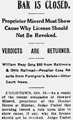 Some 32 years after his mother's death, in December 1904, Howard began to plan for a monument to be placed at the grave of his father and infant brother in Addison Cemetery, and for his mother's remains to be relocated there from the Stuck Farm so the family would be together for eternity and for convenience in maintaining the site. It took the form of a large, haunting statue, fabricated by the R.H. Koontz marble and granite works of Greensburg. The front of the base of the monument features his name in all capital letters -- "HOWARD MINARD" and includes a large, carved monogram of his intertwined initials, "H" and "M." A December 1904 article in the Connellsville Daily Courier noted that it "will be the most expensive and artistic piece of cemetery work in the county. The Addison Cemetery has now some good monuments but this will be a credit to the cemetery." In an October 1905 article in the Daily Courier, Howard let it be known that the cost of transporting the remains was $160 and of the impressive monument was $2,000. In the 1930s, laborers with the Works Progress Administration recorded all the burials at Addison Cemetery, and prepared a long typed list of the names and dates. Today, this list is available online on the Somerset County GenWeb Archives, on page 21. For all of his high flying visibility, Howard may simply have been desiring for his Dunbar hotel property to be perceived as viable and lucrative, so that he could sell it at a high markup. The Courier in May 1905 reported that Howard was considering disposing of it to M.J. Tulley, but the deal apparently fell through. A year and a half later, Howard's fortunes changed for the worse. In the fall of 1906, he alleged that Mabel Pulliam, Lillian Diebold and Roy Cunningham robbed him of a diamond ring in Pittsburgh. Judge Umbel of the Fayette County Court of Common Pleas issued a ruling that the hotel bar remain closed, and that Howard must show cause why his liquor license should not be revoked. News of the action received national exposure when published in the National Labor Tribune.