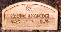 Martha "Jane" (Minard) Manbeck was born on Feb. 22, 1852 near New Rumley, Harrison County, OH, the daughter of Jacob and Mary Ann (Kimmel) Minerd. On Jan. 8, 1880, when she was was age 27, and he 28, Martha was joined in the bonds of wedlock with Daniel Manbeck (1851-1938). Rev. E.J. Collins, a minister of the divine word (VDM), performed the nuptials in Harrison County. Daniel had been married once before, to Alice A. Heidy/Henly ( ? - ? ), and had a son from that marriage, Ira M. Manbeck. Martha and Daniel went on to bear seven more offspring of their own – Charles E. Manbeck, Flossie Elberta Slates, Gertrude G. Manbeck, Ila Laura Manbeck, Jesse Sheldon Manbeck Sr., Emmet E. "Preach" Manbeck and Leona Manbeck. The federal census enumeration of 1900 shows the family residing near New Rumley, where Daniel was a day laborer and farmer. The Manbecks faced unspeakable tragedy in 1905 when eldest son Charles was killed in a railroad accident in Alliance, OH. The following month, in February 1905, the Manbecks moved to the farm of Daniel’s mother one mile north of Jewett. Then, in a domino-like effect a week later, son Emmet moved to the newly vacant Manbeck farm west of New Rumley. By 1910-1920, remaining in their New Rumley area on Rumley-Scio Road, Daniel and Jane were the only occupants of their home, the rest of the children having made their way out into the world. Daniel made a living that year as a fireman in a local sawmill. In 1930, the census-taker that the 78-year-old Daniel continued to work as a farm laborer. Daniel passed away at the age of 87, at the home of son Emmet in Jewett on May 6, 1938. Jane lived only another year longer, in her son's home in Jewett. Afflicted with a deadly case of bronchial pneumonia, she died on March 2, 1939, just eight days her 87th birthday. They are buried together at the New Rumley Methodist Church Cemetery. Their graves, which consist of simple metal plaques, were decorated with planted flowers when photographed in 2001