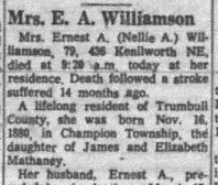 Nellie lived on for another two-plus decades, remaining in their longtime Kenilworth Avenue residence. She suffered a stroke in about March 1959 and lingered for 14 months. The angel of death mercifully spirited her away on May 24, 1960, at the age of 79. The remains were placed into eternal repose at Western Reserve Cemetery. In an obituary, the Warren Tribune Chronicle said she was "a lifelong resident of Trumbull County..." She was survived by a dozen grandchildren and a baker's dozen great-grandchildren.