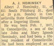 Daughter Dorothy Miner (1917-1997) was born on June 23, 1917. She twice married. On April 26, 1939, at the age of 21, she wedded her first husband, 22-year-old Albert J. Hominsky (Feb. 7, 1917-1968), son of John and Mary (Ignosh) Hominsky of Connellsville. They lived on Green Street in Connellsville's West Side and produced these children, Lois Jean McClintock Jewels, Sondra Rae Harbaugh, Albert "Kenneth" Hominsky, Mary Kathryn "Kathy" Emerick and Patricia Ann Bowman. Later, they moved to 811 South Pittsburgh Street. Albert earned a living over the years as an inspector with Anchor Hocking Glass in South Connellsville. He belonged to the Glass Bottle Blowers Association of the United States (GBBA). Dorothy was a member of the St. Vincent DePaul Roman Catholic Church. Sadly, Albert died at the age of 51 in Connellsville State Hospital on Sept. 1, 1968. Rev. Victor Petri led the funeral service, with interment in Green Ridge Memorial Park. She moved at some point to Mount Pleasant, Westmoreland County, where she joined the Bridgeport Free Methodist Church. On June 18, 1969, the 51-year-old Dorothy wed a second time to Francis Edward Flydell (Oct. 9, 1912-1996), son of John and Mary (Kogler) Flydell. Their marriage lasted for 27 years until the separation of death. He had been widowed twice previously and brought these adult offspring to the second union -- Mary A. Mangus, Frances L. Wascak and Margaret A. Basinger. During his working years, Francis was a heavy equipment operator. Francis entered eternity on Nov. 24, 1996. Dorothy only outlived him by a year. At the age of 80, on Sept. 5, 1997, she passed away in St. Francis Hospital in Pittsburgh. Rev. Dean Griffiths officiated at her funeral service.