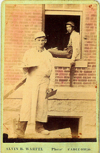 John was a popular merchant, and at one time was proprietor of a store in Scio, near New Rumley. An inventory document of the store still exists. He is believed to be the same man holding a mortar board of plaster in the photo seen here, found in the collection of his father's cousin, Jemima (Minerd) Burditt, of Tontogany, Wood County, OH. Note the green color of the cardboard onto which the image is attached, made by photographer Alvin B. Warfel of Cadiz, Harrison County. On Nov. 16, 1897, at the age of 27, John married 24-year-old Mildred Irene Ryel (Dec. 5, 1873-1926), the daughter of Franklin B. and Julie E. (Thompson) Ryel of North Ridgeville, OH. Her parents did not approve of the marriage. They had met by corresponding via mail, when Mildred was living at Strongsville, Cuyahoga County, OH. The ceremony was performed by Rev. Mr. Winers. Shortly afterward, reported the Cadiz (OH) Republican: They arrived home on Thursday and the following evening were serenaded by the band. Mr. Miner is a prominent business man at this place and is one among the most highly esteemed young men of New Rumley. The writer, with many others, wishes them a happy future. John and Mildred had five children -- Harold Wendell Miner, Gerald Miner, Hertha Wittenbrook, Metta Iona Wise and Verdie Julia Welsh. When the federal census was taken in 1900, John, Mildred and infant son Harold resided together in the village of New Rumley. John's widowed mother Rachel, age 56, lived a house or two away.