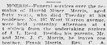 In 1910, the census shows the Morrises on 107 West Warren Avenue in Tampa. They had been married for 37 years. Joseph worked as a clerk in the United States Post Office, and unmarried 30-year-old son Harold as a stenographer. Newlywed son Francis was residing on the same street with his wife Pearl, and was employed as a "Turner" in a "novelty works." Joseph was still working as a post office clerk at the age of 70 when the census was enumerated in 1920. They were living on West Warren Avenue. Son Frank and his wife Pearl were next door neighbors, and had three children -- Frances Morris, Dorothy Morris and Frank Morris Jr. Heartache rocked the family in 1919, when son Harold Miner Morris (1879-1919) died at the age of 40 on March 4, 1919. Harold, who lived with his parents, was buried in Woodlawn Cemetery. The Tampa Tribune named his pallbearers as Joseph Kirk, Clyde Hicks, T.J. Carruthers, Charles R. Sparrow, William Mathews and James Mansfield. Lina passed away a little more than a year after her son Harold. She died on June 16, 1920, at the age of 71. The Tampa Tribune noted that she was survived by her husband, son Frank and sister Ella Holt. The funeral was held at the J.L. Reed funeral parlor, followed by burial at Woodlawn Cemetery. Pallbearers were O.F. Stockwell, T.J. Caruthers, Dr. Falds, J.E. Matthews, W.D. Burgess and E.T. Gallagher.