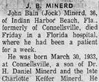On July 19, 1958, at the age of 25, he married Betty Lou Lessman ( ? - ? ) of Mount Pleasant, Westmoreland County. Their wedding was held at the First Presbyterian Church in Connellsville, with Dr. Francis G. Stewart officiating. Prior to marriage, Betty had been employed as a secretary with Robertshaw-Fulton Controls in Youngwood and was an active volunteer in civic and club committees in Mount Pleasant. The Minerds produced two children -- John Bain Minerd Jr. and Harold Daniel Minerd II. Jock was a member of the Connellsville United Presbyterian Church and King Solomon's Lodge of the Masons. The Minerds eventually moved to Indian Harbor Beach, FL, where Jock was employed as a computer operations supervisor for Boeing Aircraft Corporation. Tragically, Jock died at the age of 36, in a Florida hospital, on Feb. 6, 1970. His remains were returned to Connellsville for burial. Betty's fate is unknown. Son John Bain Minerd Jr. (1960- ? ) was born on Sept;. 28, 1960. He is believed to reside in Melbourne, FL. Son Harold Daniel Minerd II ( ? - ? )