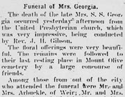 Among the mourns who traveled to attend the funeral were Mr. and Mrs. Arbuckle, of Weir, KS; Mr. and Mrs. J.A. Renfro, of Girard, KS; Mr. and Mrs. William Alcorn, of Arma, KS; and Girard Ramet and son of Littlefield, KS. Today, no stone is known to mark Laveria's grave. They are mentioned in the 1921 book, A Genealogical Record and History of the Georgia Family in America, by Elmore L. Brooks. The volume traces the children and descendants of William and Sarah (Cable) Georgia and of Elijah Burr and Kaziah (Stewart) Georgia. It spells her name "Laria Minard" and says they had "No children."