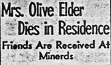 Olive Pearl (Minerd) Elder was born on Aug. 28, 1883 in Vanderbilt, Fayette County, PA, the daughter of William H. and Missouri (Shelkey) Minerd. During the early 1900s, Olive and two of her siblings moved to McKeesport, near Pittsburgh, to find work. There, her sister Nettie married driver John H. Kerr; and brother Seth worked as a blacksmith and married Ida Kimmel.