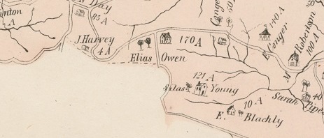Their home in 1860-1870 was in Morris Township, Washington County, with Elias making a living as a farmer. In 1860, they dwelled within a short distance of Elias' parents and brothers Aaron and Benjamin Jr. and their families. When Caldwell's Illustrated Historical Centennial Atlas of Washington Co., Pennsylvania was published in 1876, Elias's 170-acre farm was depicted along the southern border of Morris Township, to the northwest of the village of West Union. The federal census enumeration of 1880 shows the family remaining in Morris Township. Elias headed a household which included his 36-year-old daughter, two Robertson grandchildren and 80-year-old mother Mary. At the age of 77, Elias contracted a fatal case of typhoid fever and succumbed to the spectre of death on Sept. 8, 1896, at home near West Union, Morris Township. An obituary in the Waynesburg Democrat noted that he was survived by his wife and two adult daughters. Burial was in West Union Cemetery, following funeral services led by Rev. J.R. Morris. Daughter Caroline Owen (1844- ? ) was born in about 1844. On Nov. 3, 1867, she married Milton Robertson ( ? - ? ). Their two known children were Cora Robertson and Elias Frank Robertson. When the United States Census was made in 1880, the 35-year-old Caroline and her two children lived with her parents near West Union, Morris Township, with Milton residing next door with his single sisters and nephew. In 1896, her home remained near West Union. Research by others hints that death overtook her on Sept. 18, 1898. This needs to be confirmed.