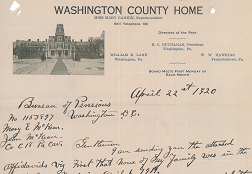 Daughter Sarah "Jean" Owen (1870-1944) was born on Aug. 27, 1870. She was unmarried in 1892 at the time of the death of her mother. Jean eventually was wedded to William H. Hagerty Sr. (1864- ? ). The couple produced one known son, William H. Hagerty Jr. They resided in the Wind Ridge area for decades and were members of the Wind Ridge Presbyterian Church. In about 1934, Jean was admitted to the Curry Home near Waynesburg, and remained as a patient for a decade. She suffered from hardening of the arteries and died there after suffering a cerebral hemorrhage on Oct. 22, 1944, at the age of 74. Burial was in Oak Spring Cemetery in Washington County, with Mrs. Krause of 650 East Maiden Street in Washington signing the death certificate. An obituary was published in the Waynesburg Democrat.