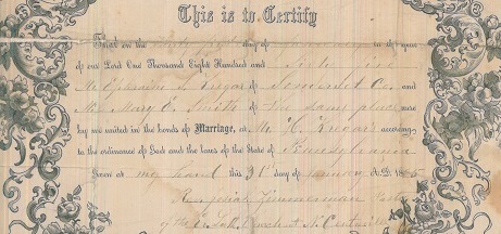 Mary Elizabeth (Smith) Kreegar was born on June 6, 1841 in Somerset County, PA, the daughter of Eli and Mary "Polly" (Younkin) Smith. She was very young when her father died and was about four when her mother wedded a second time to Aaron Schrock. Mary grew up in the Schrock household in Middlecreek Township, Somerset County. Circa 1860, at the age of 19, she was listed by the census-taker as a "domestic." On Jan. 31, 1865, she married Civil War Ephraim Smith Kreegar Sr. (Aug. 22, 1842-1910), son of John "Dietrich" and Sarah (Shaulis/Shawley) Kreger, the father an immigrant from Germany. Rev. Josiah Zimmerman, an old preacher of the Evangelical Lutheran Church of New Centerville, officiated at the wedding, held in the residence of H. Kreegar in New Lexington. Among those in attendance were Mary Minder and Ephraim's cousin William S. Kregar.