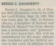 Caroline "Bessie" (Van Dyke) Daugherty was born in 1905 in Strickler, Westmoreland County, PA, the daughter of Samuel Aaron and Bertha Mae (Minerd) Van Dyke. She wedded John L. Daugherty (1898-1981) of Foxtown, Westmoreland County. They had seven children -- Betty Griffin, Nellie Nutter, Floyd Daugherty, Larry Daugherty, Gerald L. Daugherty, Dale D. Daugherty Donald Daugherty. Sadly, son Dale died at age six months on Jan. 3, 1928 from what physicians called "interstitial intussusception" -- twisted intestines blocking the flow of blood and nutrition. His tender remains were interred in Hillis Cemetery in Greensburg.