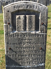 The fate of Nathan is not precisely known because the evidence is confusing. Two excellent sources -- his gravestone and handwritten pastoral records of their clergyman Rev. Eli Keller -- state that he passed away in 1873, when he would have been age 58 or 59. But the United States Census of 1880 shows that he was still alive and living with his unmarried daughter Amanda and next door to his married daughters Lovina Leibensperger and Sarah Miller. This anomaly is simply un-explainable. Either way, Nathan's interment was in Huff's Church Cemetery. Sarah outlived her spouse by a dozen years. Burdened with "consumption of marrow," wrote her pastor, she died at the age of 64 on Feb. 7, 1885 with burial at Huff's Church. [Find-a-Grave] Rev. Keller's notes recorded that her offspring included three sons and five daughters. Virtually identical, upright stone markers were erected at both of their graves, each featuring a rounded top edge and a carving of an opened Bible, a common motif in this burial yard. Both were inscribed in the old German script. On Sarah's, her maiden name of "Wetzel" was lettered on the face as well as the name of her husband. Nathan's appears to have been broken into three parts at some point in time, but restored into their place, with the pieces bolted together.