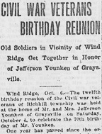 Jefferson Younken (1843-1935) was born on Oct. 5, 1843 in Somerset County, the son of Charles L. and Nancy (Henry) Younken. He was a wounded veteran of the Civil War. He stood 5 feet, 10 inches tall and weighed 165 lbs., with a dark complexion, grey eyes and black hair. As an old man, during an interview, Jefferson said that there was no public or church record of his birth, and that the only record he had was in his own family Bible which was copied from his mother's old Bible some 40 years earlier, in about 1873. He also noted that his mother's Bible was lost and he was unable to find any trace of it. Jefferson as a boy moved with his parents and siblings to Richill Township, Greene County. He remained in their home until the age of 19, when he left to join the Union Army during the Civil War.