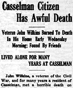 Rachel died in the Rhoads' home in Deerfield on July 5, 1915 at age 72. Her remains were brought back to Casselman for burial at Mt. Union Cemetery. The entrance to the cemetery is seen here, in July 2007, photographed during the annual Younkin Reunion weekend. Wilkins only outlived Rachel by a little more than a year, continuing his work as a postal carrier. Tragedy struck on Oct. 15, 1916, when he failed to report to work. Friends visited his home, only to find to their horror that the 77-year-old had died overnight in a house fire. A newspaper article reported that: ...smoke was seen issuing from the cracks in the door and windows of the building. Hurriedly breaking down the door the body of the man, burned to a crisp, was found lying on the bed which was also burned and still smoldering. It is the opinion of those more familiarly acquainted with the situation that Mr. Wilkins had arisen Wednesday morning, lighted his lantern with the intention of getting ready for his work, and probably not feeling well had set the lantern at the side of the bed and again laid down. Bedclothing falling near the lantern became ignored and in the small and stuffy compartment the smoke soon overcame the unfortunate victim.