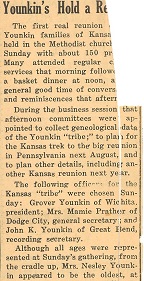 ~ 1937 Younkin Reunion ~ The first real reunion of the Younkin families of Kansas was held in the Methodist church on Sunday with about 150 present. Many attended regular church services that morning followed by a basket dinner at noon, a general good time of conversation and reminiscences that afternoon. During the business session that afternoon committees were appointed to collect geneological data of the Younkin "tribe;" to plan for the Kansas trek to the big reunion in Pennsylvania next August, and to plan other details, including another Kansas reunion next year. The following officers for the Kansas "tribe" were chosen Sunday: Grover Younkin of Wichita, president; Mrs. Mamie Prather of Dodge City, general secretary; and John K. Younkin of Great Bend, recording secretary.