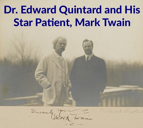 The origin of their friendship is not yet known but may have taken shape in about 1904. In June of that year, during a stay in Florence, Italy, Twain's beloved wife Olivia died. Three months later their daughter Clara, suffering from over-exertion and depression, is known to have been admitted to Edward's sanitarium in Norfolk, CT for what author Ron Chernow called an "extreme 'rest cure'." In this environment, Edward allowed her no guests, no letters and no other reading material. During that treatment, Chernow writes, Clara "slept normally for the first time in a year. Able to sing and play the piano again, she projected a concert tour that winter; the doctors even granted her a July visit from her father and sister." Twain was delighted with this care for his daughter. He and the Quintards are known to have exchanged letters in that same year 1904, with Edward's notes preserved today by the Mark Twain Project at the University of California's Bancroft Library. When Twain's other daughter Clara suffered an attack of appendicitis in May 1905, Edward assisted New York physician Dr. Frank Hartley in the surgery. Reported the Elmira (NY) Star-Gazette, Miss Clemens is a handsome young woman, well known in Elmira, where the family has relatives and where Mrs. Clemens lived. Miss Clara Clemens has inherited her father's wit, and, besides, is an accomplished vocalist." Edward prescribed a mustard bath for a Twain illness early in the relationship. Then in the heat of August 1905, Twain became stricken with gout at his summer cottage at Edgewood, shortly after attending the funeral of his nephew Samuel Moffett, who had drowned at the Jersey Shore. Edward traveled to attend his star patient in person. With Twain nauseous and unsteady on his feet, Edward advised him to stay close to home until the weather cooled.