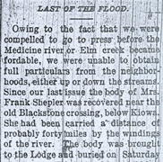 Note -- the following was told by my mother that happened in Kansas in the spring of 1885. It had been a warm day but toward evening black clouds bean to roll up in the northwest. In the night there was a cloudburst at the head of Medicine River and the water came down Elm Creek -- 5 feet -- in a roll sweeping everything before it. The back water rose two feet in our house. The first we knew of the flood was when the water was even with our beds when we woke up.