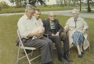 Four generations, 1960s, l-r: Harvey "Dean" Miner holding baby